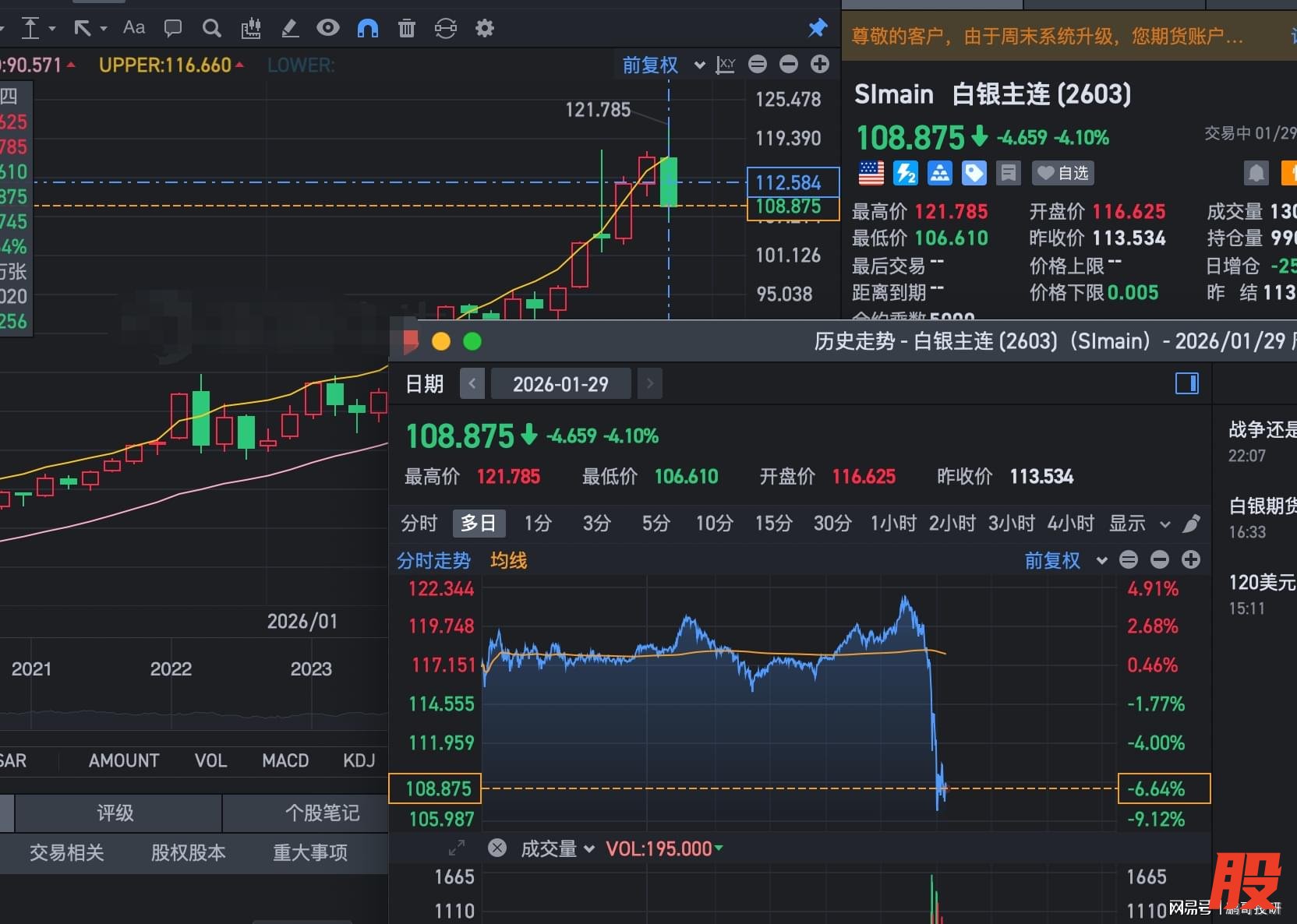 就在刚刚白银期货从出现巨幅的跳水,股价从涨7%,也就是从122的价格,一下子暴跌了到跌7%。也就是直接跌破了108,从高位下来股价暴跌了12%以上。